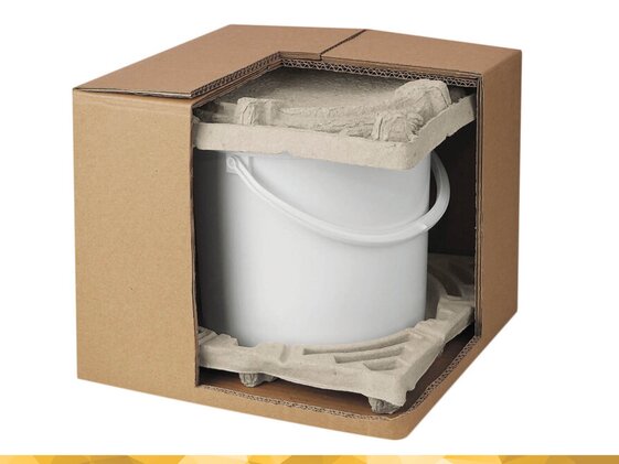 BucPac ist eine passgenaue Versandverpackung für einzelne Eimer aus formstabilen Faserformteilen – entwickelt für sicheren, effizienten und materialschonenden Versand.